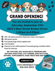 25 Sep Lake Dog Grand Opening Sept 27th Posted at 10:18h in Broken Arrow News by Debra Wimpee 0 Comments 0 Likes GRAND OPENING CELEBRATION! Join us Saturday, September 27th from 1:00–4:00 PM for the official Grand Opening of Lake Dog’s! 1605 S Main Street, Broken Arrow Specials & Fun: 25% OFF select premium dog food, treats, and toppers Free goody bags (while supplies last) Free samples 360° photo booth Raffle baskets – proceeds benefit Soldier’s Wish Paws for Patriots What you’ll find at Lake Dog’s: Self-Wash Bays Premium & Natural Dog Food Cat Corner Dog Hats & Apparel Supplements A HUGE Treat Bar … and so much more! We’re proud to support Soldier’s Wish and can’t wait to celebrate with you and your pets!